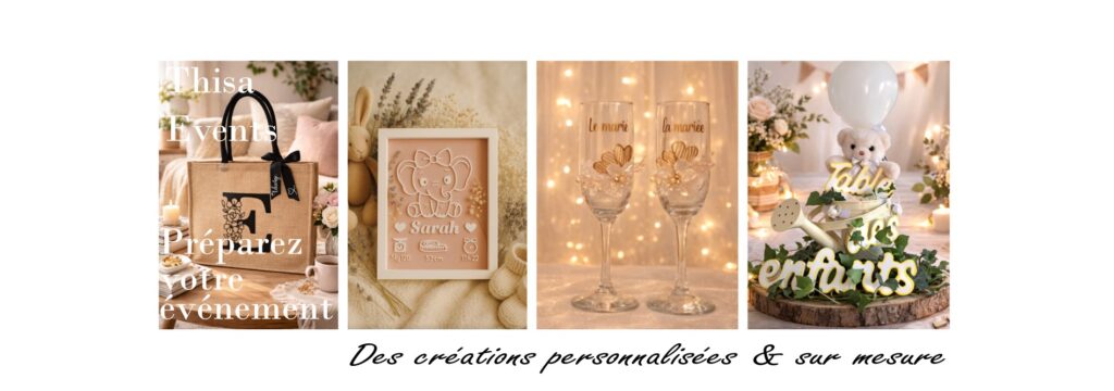 Boutique créative spécialisée dans la décoration et les objets événementiels personnalisés, de la petite attention sur mesure à la mise en scène complète de votre salle de réception.